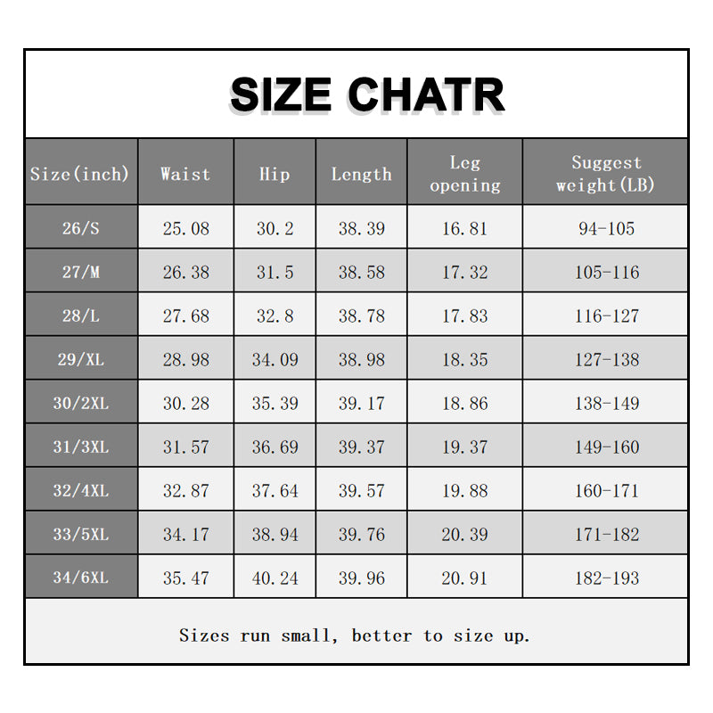Größen: 26/S, 27/M, 28/L, 29/XL, 30/2XL, 31/3XL, 32/4XL, 33/5XL, 34/6XL