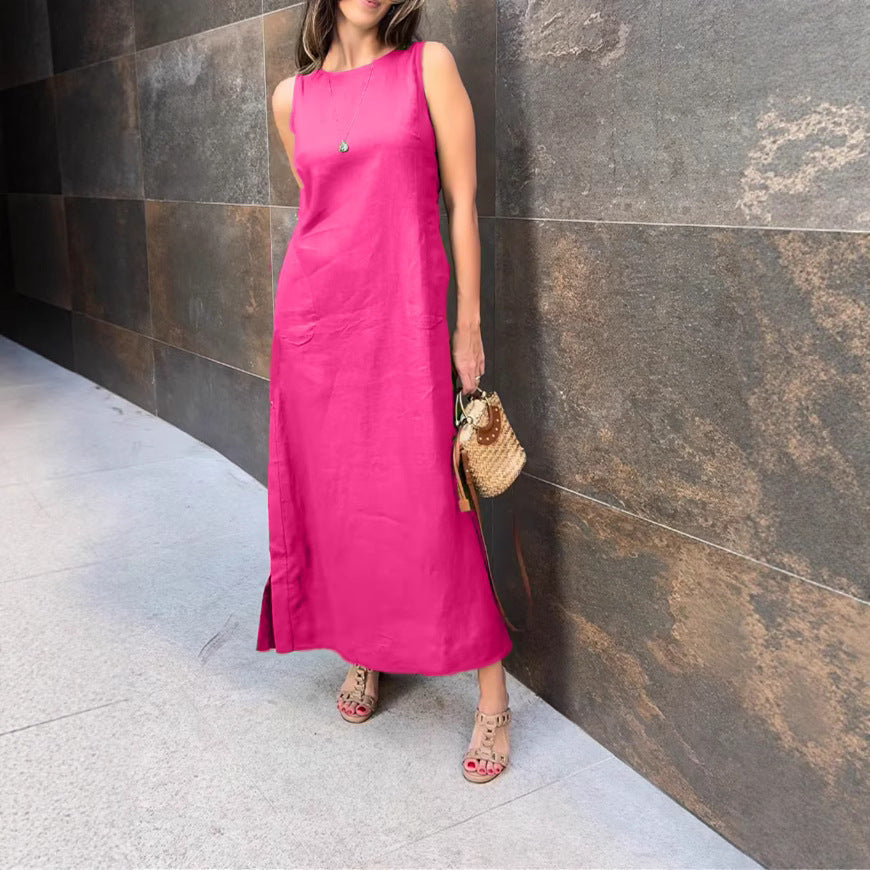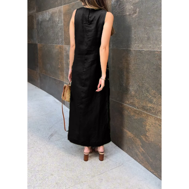 Ärmelloses Kleid für Damen in Volltonfarbe mit seitlichem Schlitz und Knöpfen