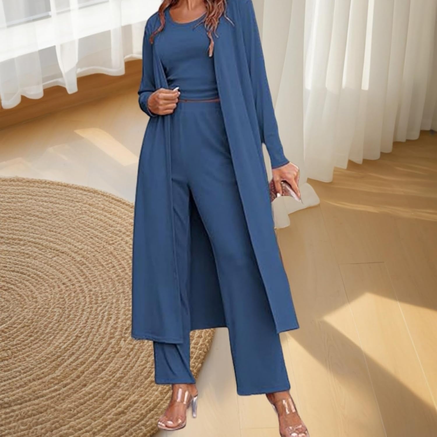 STILVOLLES 3-TEILIGES SET: Dieses lässige Set besteht aus einer ärmellosen Weste, einem Cardigan und vielseitigen Hosen. Passen Sie den Sitz individuell an und genießen Sie jederzeit eine schmeichelhafte Silhouette.