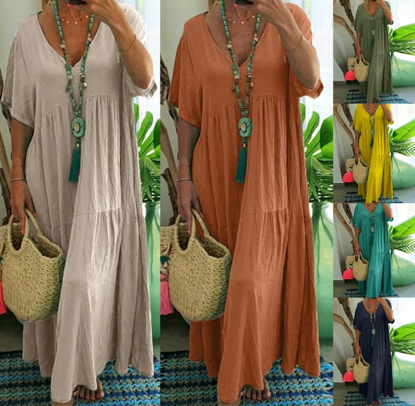 Entdecken Sie unser lässiges langes Damenkleid mit kurzen Ärmeln – die perfekte Wahl für Strandausflüge oder Vintage-Partys. Dieses Kleid besteht aus Naturfasern und Baumwolle und bietet außergewöhnlichen Komfort und Langlebigkeit.