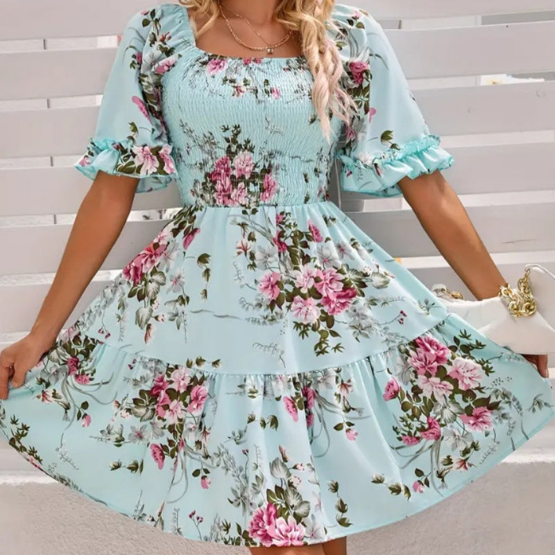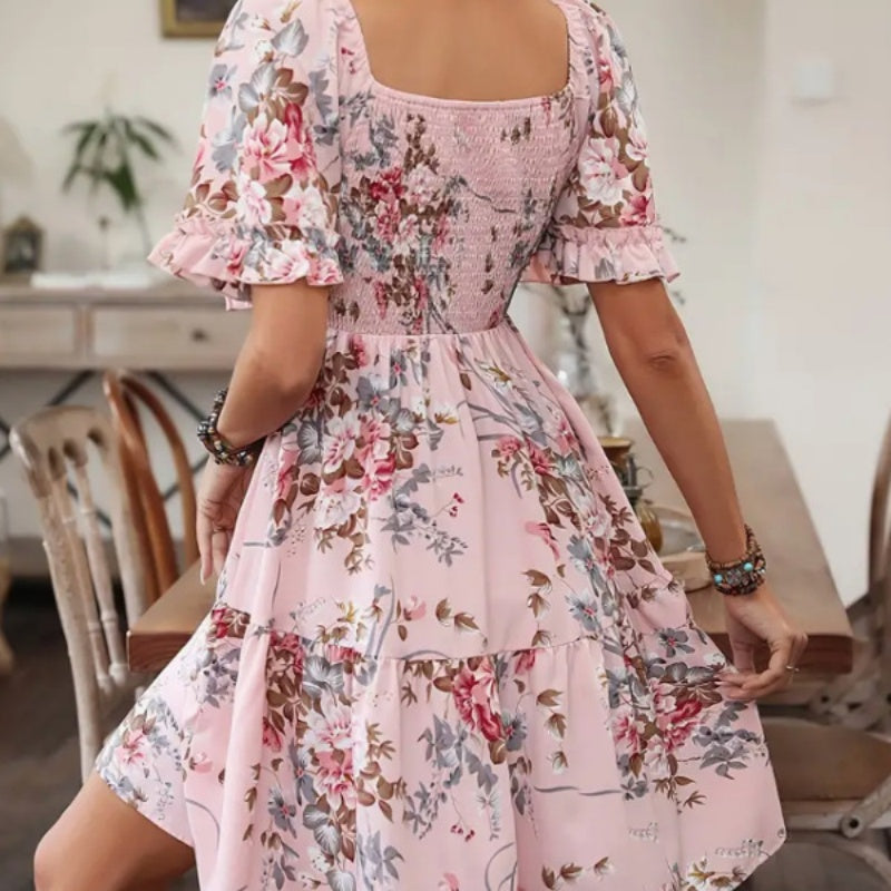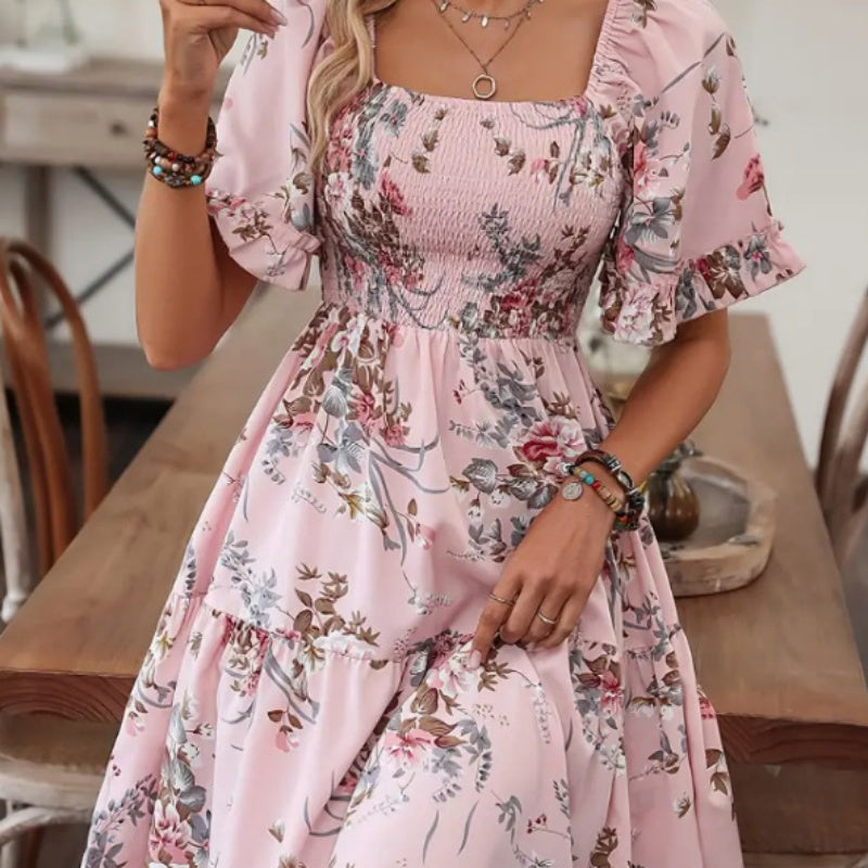 Elegantes, gesmoktes Kleid mit quadratischem Ausschnitt und Blumendruck für Damen