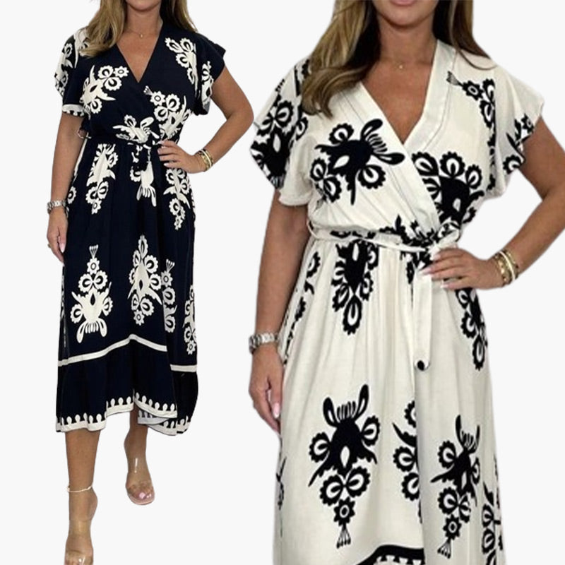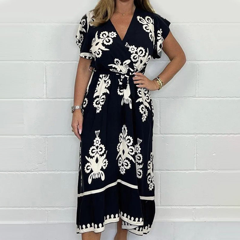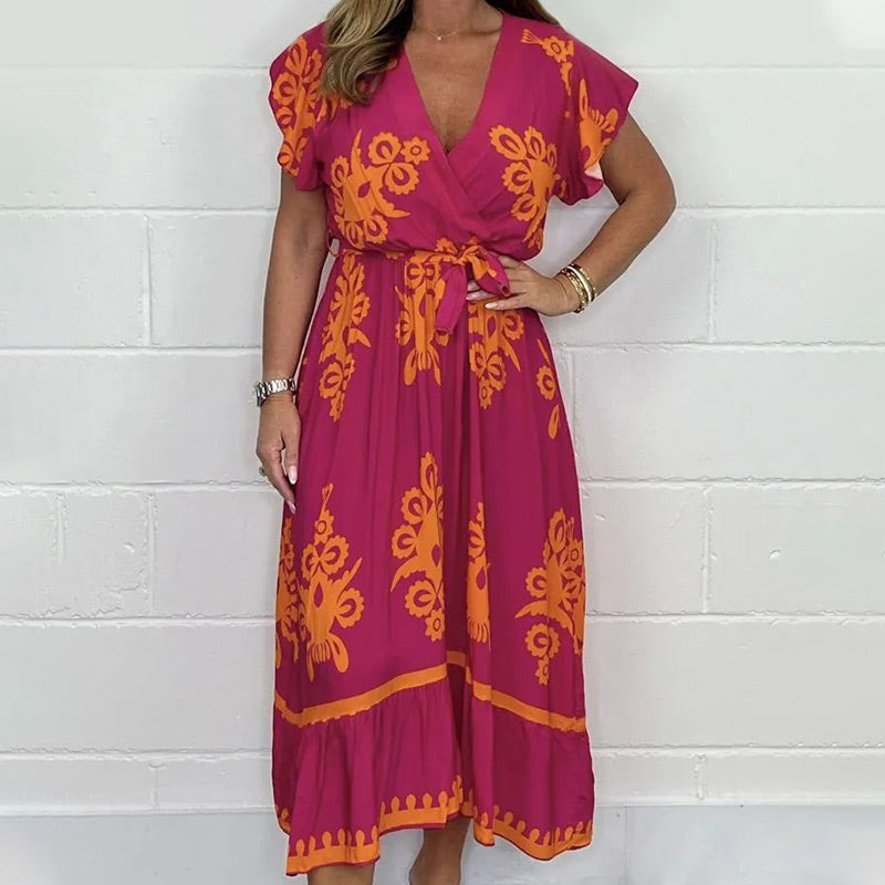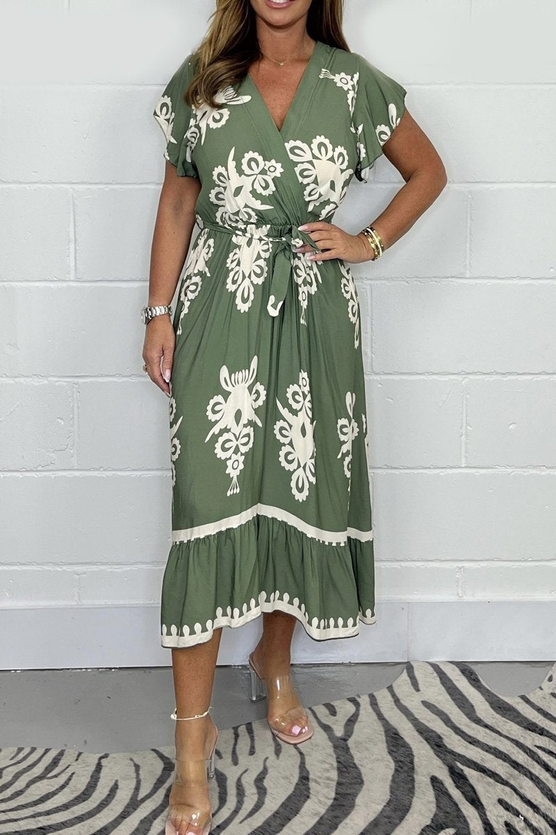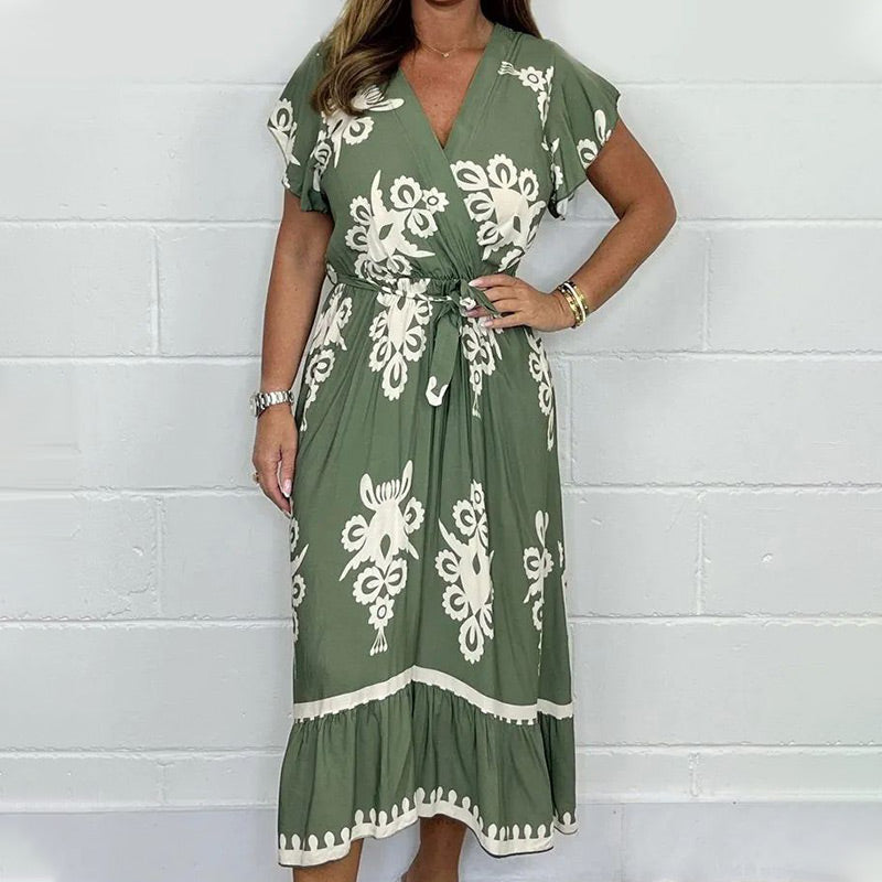 SCHMEICHELHAFTES DESIGN: Dieses Kleid besticht durch seine figurschmeichelnde Silhouette mit V-Ausschnitt und Lotusblatt-Ärmeln, die Ihrer Sommergarderobe einen Hauch von Eleganz verleihen.