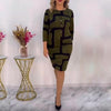 MODERNES GEOMETRISCHES MUSTER : Das kräftige geometrische Design verleiht ein zeitgenössisches Flair und macht das Kleid zu einem herausragenden Stück, das die Aufmerksamkeit auf sich zieht.