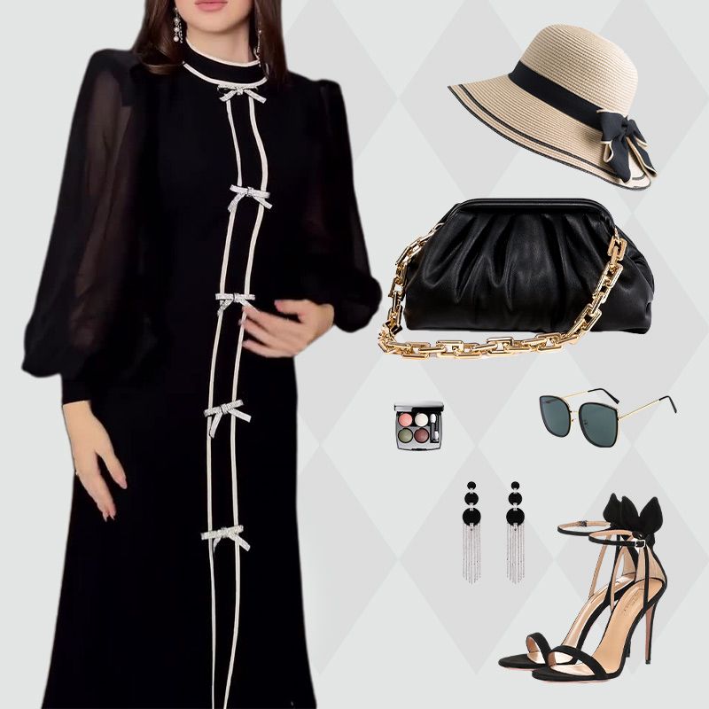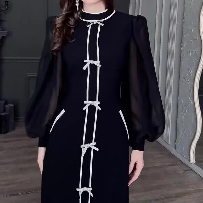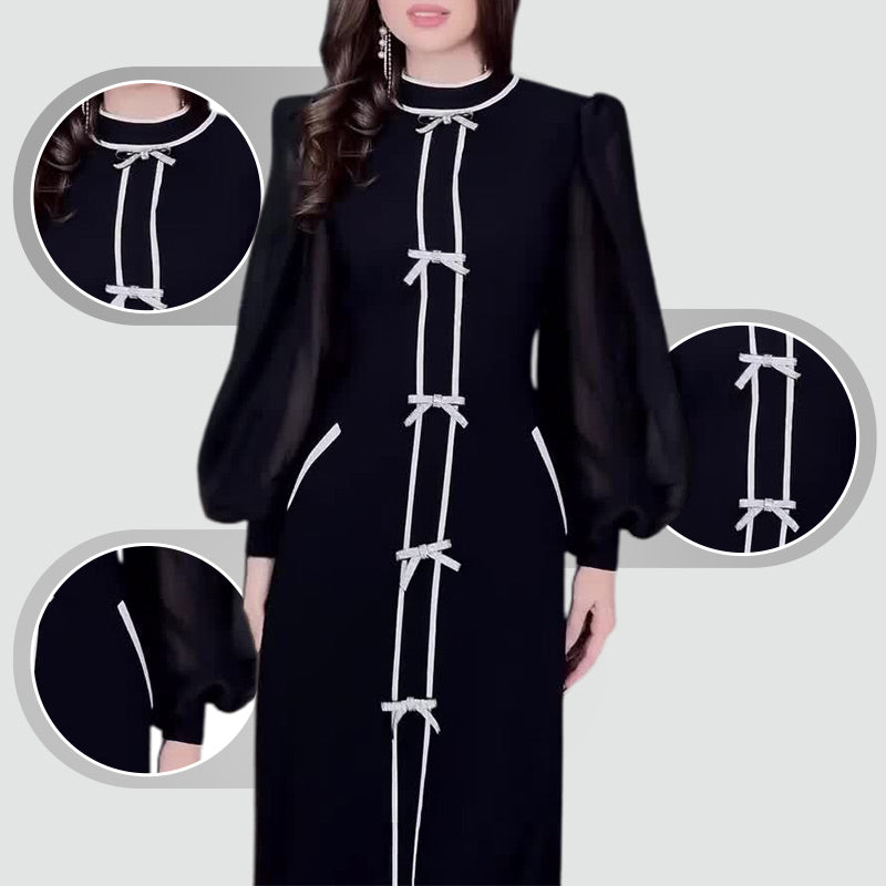 STILVOLLES PATCHWORK-DESIGN: Setze auf einen edlen Look mit dem schicken Schwarz-Weiß-Patchwork-Muster und der Schleifen-Dekoration, die dem Kleid sowohl Eleganz als auch Struktur verleiht – für einen makellosen Auftritt.