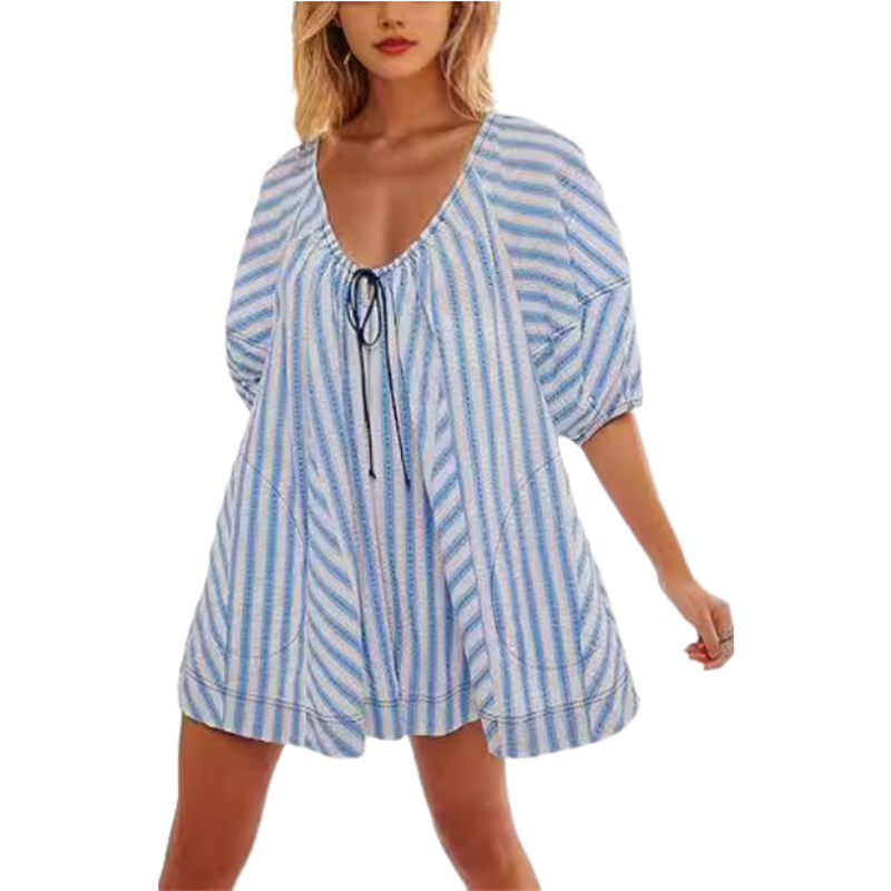 STILVOLLES DESIGN – Das Streifendesign mit geringer Sättigung am gesamten Körper ist erfrischend und die Puffärmel lassen diesen übergroßen Overall mit Rundhalsausschnitt und Streifen sehr süß aussehen.