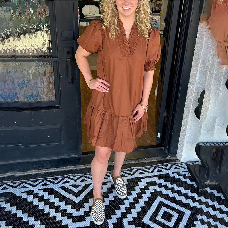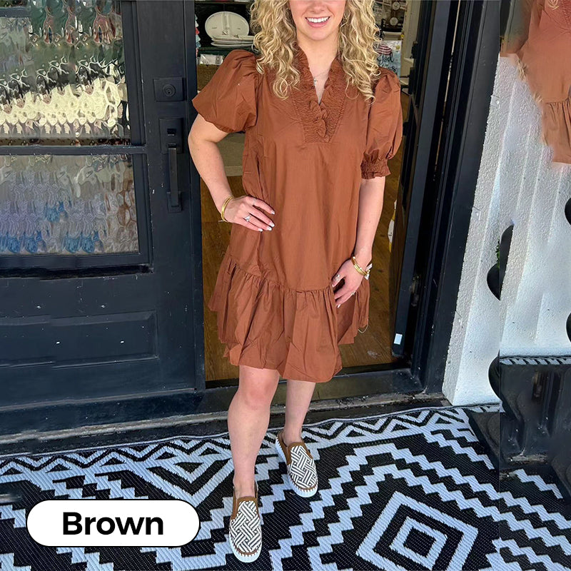 VERSPIELTER RÜSCHENSAUM – Der Rüschenabschluss verleiht dem Kleid eine verspielte Eleganz und Bewegung, sodass es ideal für einen stilvollen, aber dennoch legeren Look für den Alltag ist.