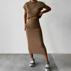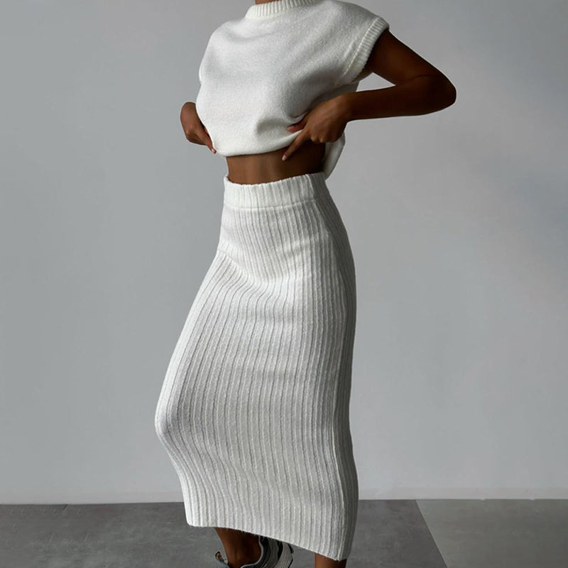 SCHICKES UND STILVOLLES DESIGN : Dieses zweiteilige Set besteht aus einem ärmellosen Pullover mit Rollkragen und einem hoch taillierten, figurbetonten Midirock und verbindet Eleganz mit einem modernen, eleganten Look.