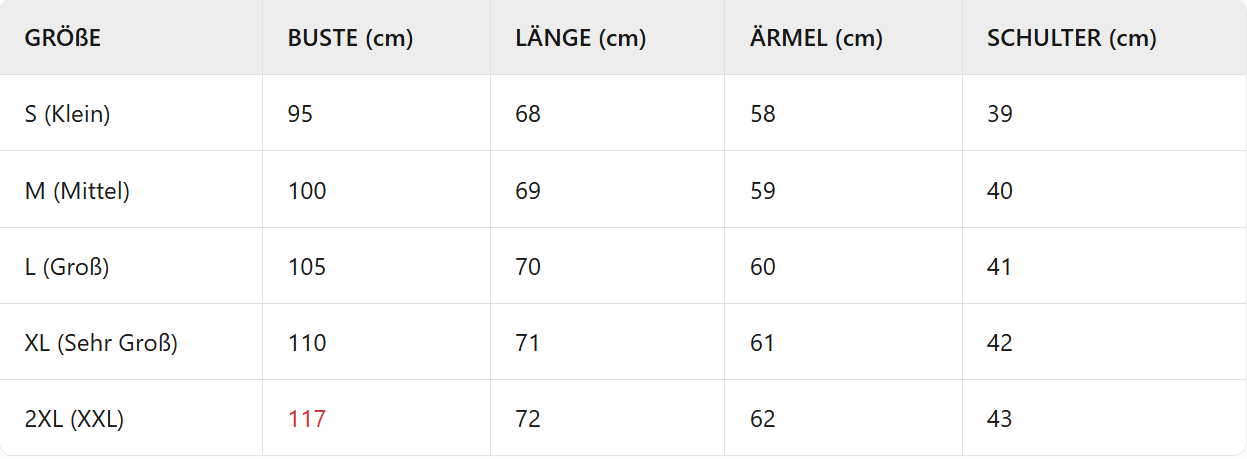 GRÖßE | BUSTE (cm) | LÄNGE (cm) | ÄRMEL (cm) | SCHULTER (cm) |