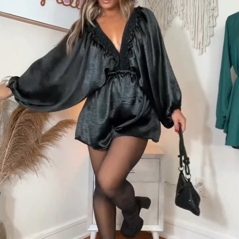 Lieferumfang: 1 × Eleganter Damen-Overall mit langen Ärmeln und V-Ausschnitt in Schwarz