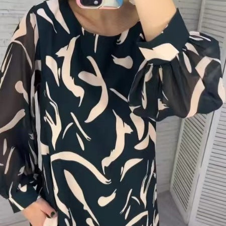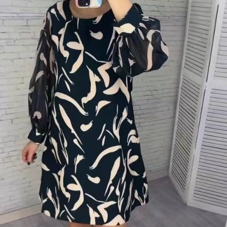 🎉 Frohes neues Jahr! 50 % RABATT 🛍️ Langärmliges Kleid mit Rundhalsausschnitt und lockerem Print für Damen