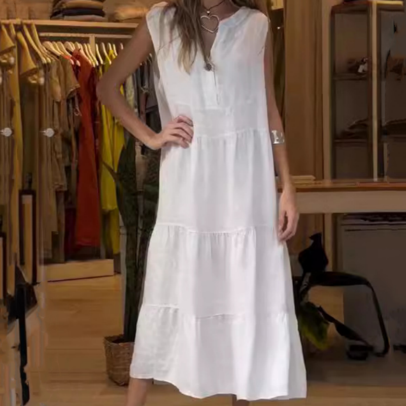 👗49% Rabatt🌸 Ärmelloses, gestuftes langes Damenkleid mit V-Ausschnitt und Knöpfen